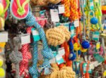 Pet care concept, various pet accessories and tools, toys, balls, brushes in a pet store, shelves with accessories. Close-up.